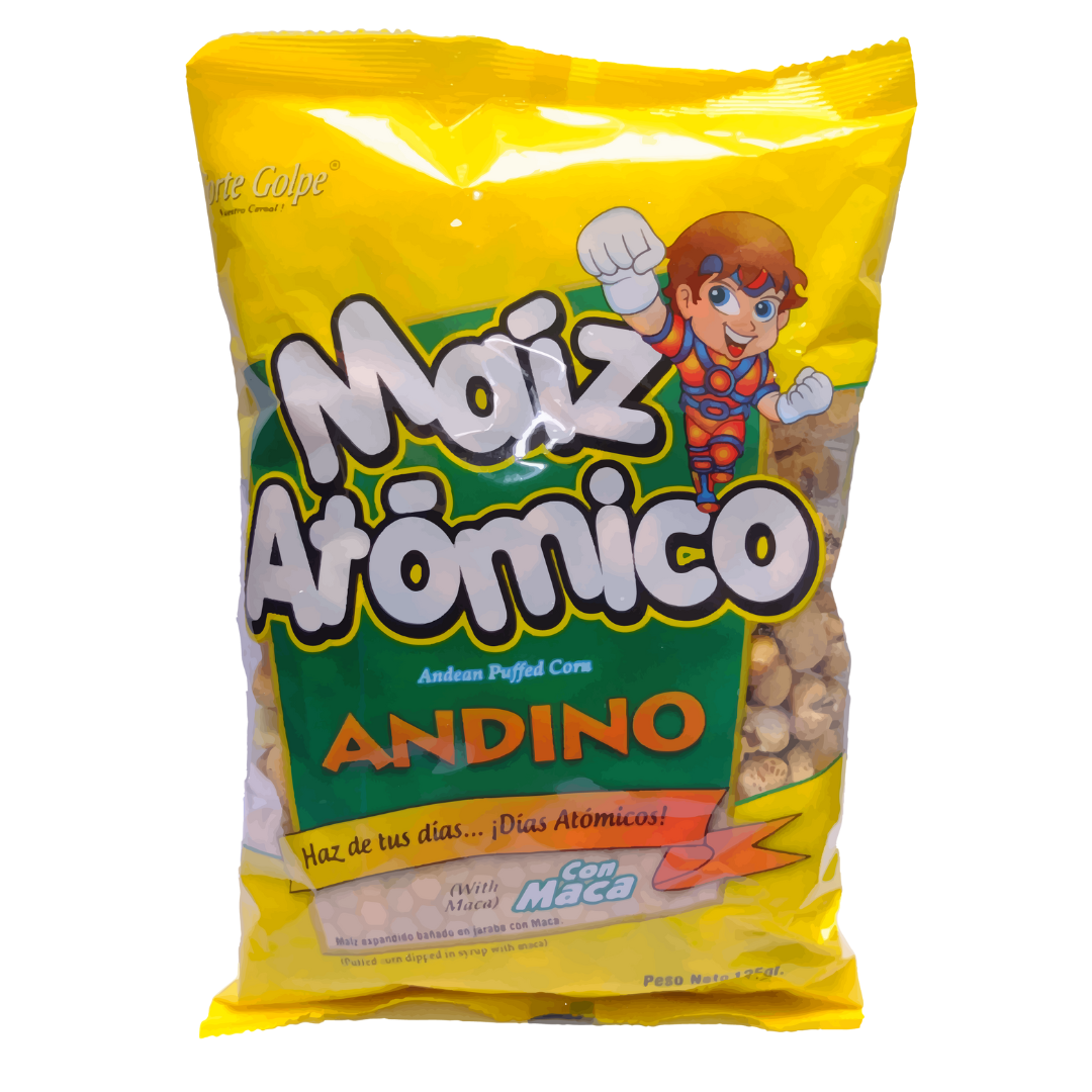 Maíz Atómico d’Andino est bien plus qu’un simple maïs grillé. En effet, il est élaboré à partir de grains de maïs géants de la variété « Choclo », cultivés dans les vallées andines. Une fois grillés à la perfection, ces grains acquièrent une texture incroyablement croustillante. De plus, ils sont ensuite enrobés d’un assaisonnement piquant et savoureux qui réveille le palais. Par conséquent, chaque grain est une véritable explosion en bouche, alliant le croquant XXL du maïs à une chaleur épicée parfaitement maîtrisée.